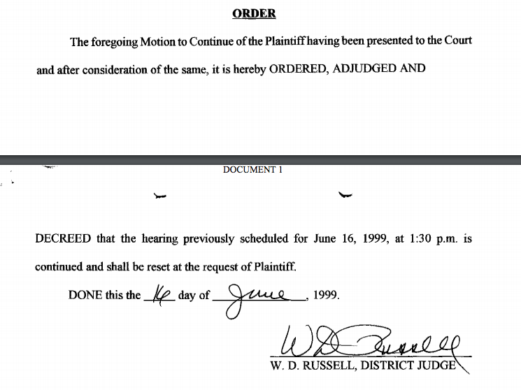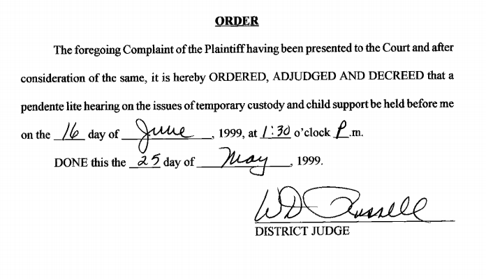 The documents do show that Nelson, then Beverly Harris, filed a divorce action against her then-husband in May of 1999. All of the initial documents, however, were signed by a different district judge, W. D. Russell. On May 25, 1999, Judge Russell scheduled the first hearing for the case for June 16.