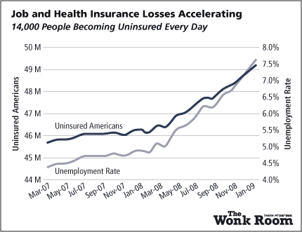 Since spring 2007, 3.5 million Americans have lost their health benefits and are now uninsured. And while the stimulus begins to address the skyrocketing health costs and lack of access to coverage, the ranks of the uninsured will only grow as the recession persists. In fact, according to a forthcoming analysis by The Wonk Room’s James Kvaal and Ben Furnas, approximately 14,000 people a day are losing their health coverage: