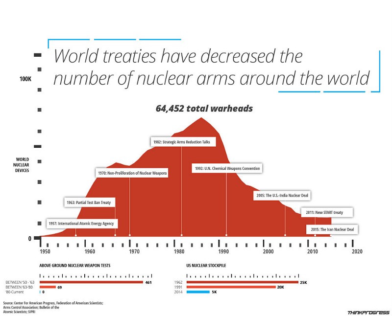 But over the past 30 years, the world has become a safer place as the United States has participated in a variety of international treaties to reduce the number of nuclear warheads, from 64,452 in 1986 to 10,315 last year.