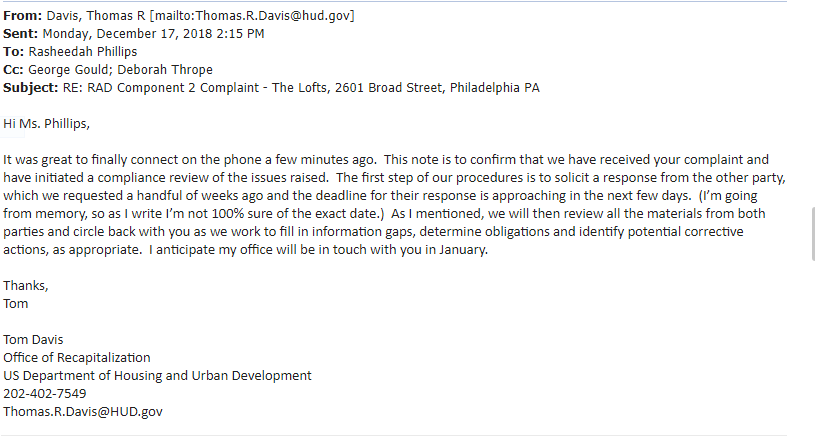 As early as January 2017, attorney Rasheedah Phillips started to complain to HUD about problems at the The Lofts at 2601. After months of inaction by HUD, she and a colleague at Community Legal Services of Philadelphia filed a formal complaint last July. Five months later, on Dec. 17, Tom Davis, current director of HUD’s Office of Recapitalization, which oversees RAD, said his office was looking into Phillips’ complaint. Davis told the National Housing Law Project in a Feb. 19 email that the investigation had been set back by the government shutdown, but that it is ongoing.