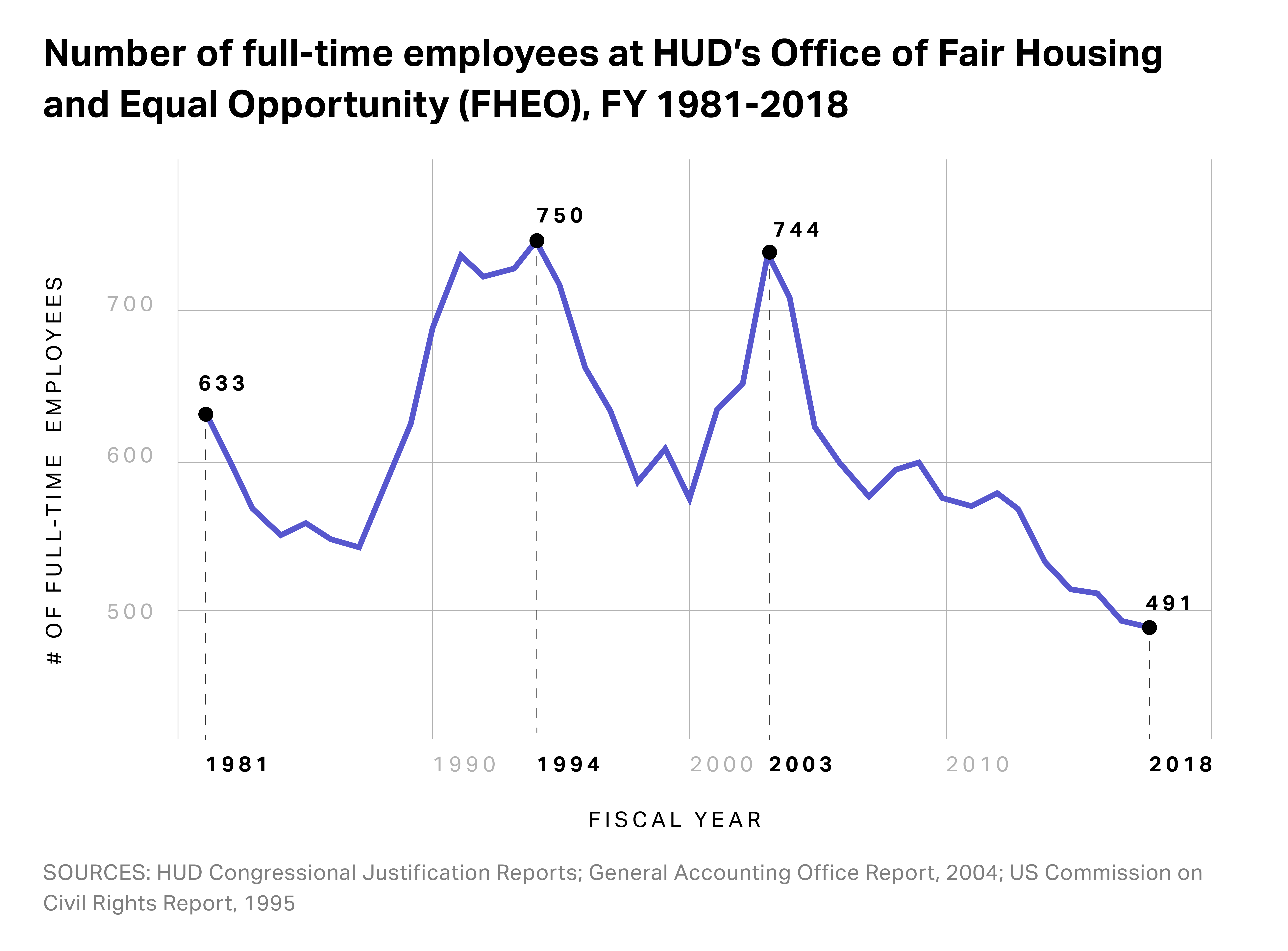 ThinkProgress has identified historically low levels of staffing at a number of HUD divisions that likely contribute to slow response times. For example, HUD’s Office of Fair Housing and Equal Opportunity (FHEO) oversees fair housing complaints or allegations of discrimination against a member of a protected class, such as racial minorities or people with disabilities, during RAD conversions. A ThinkProgress review of FHEO’s staffing levels documented in congressional budget justification reports, a 2004 GAO report, and a 1995 Commission on Civil Rights report found the number of employees has dwindled to its lowest levels since at least 1981.