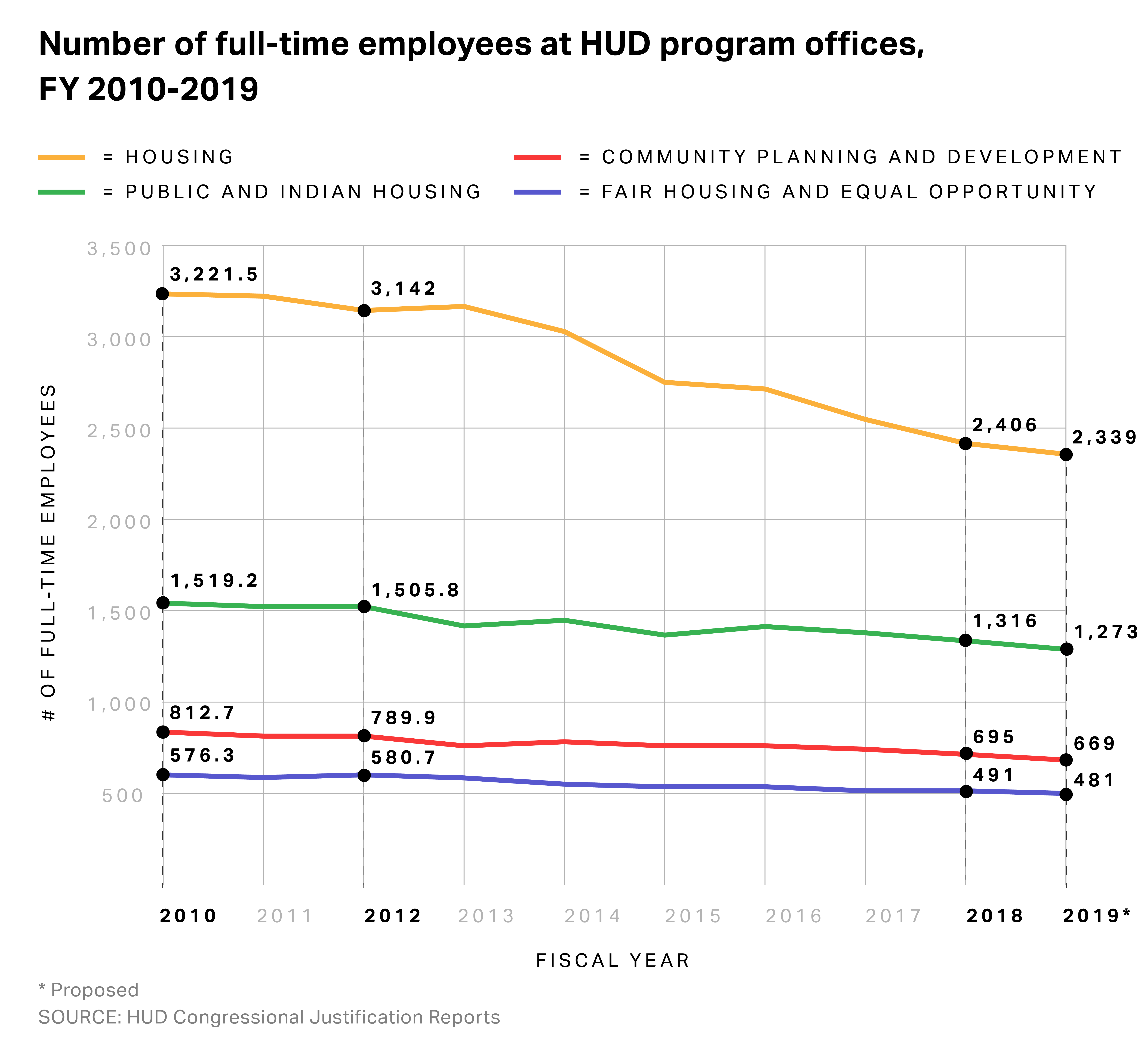 The Office of Public and Indian Housing reviews cases when public housing and project-based voucher requirements are not being followed during conversions, said Brown. But staffing levels there have dropped from about 1,519 full-time employees in 2010 to 1,316 in 2018.