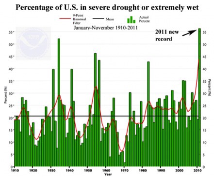 “Climate is what you expect, weather is what you get.” 129,404 weather records in one year? You can’t point to any one weather extreme and say “that’s climate change”. But a warmer atmosphere loads the dice, increasing the potential for historic spikes in temperature and more frequent and bizarre weather extremes. You can’t prove that any one of Barry Bond’s 762 home runs was sparked by (alleged) steroid use. But it did increase his “base state,” raising the overall odds of hitting a home run. A warmer atmosphere holds more water vapor, more fuel for floods, while increased evaporation pushes other regions into drought.