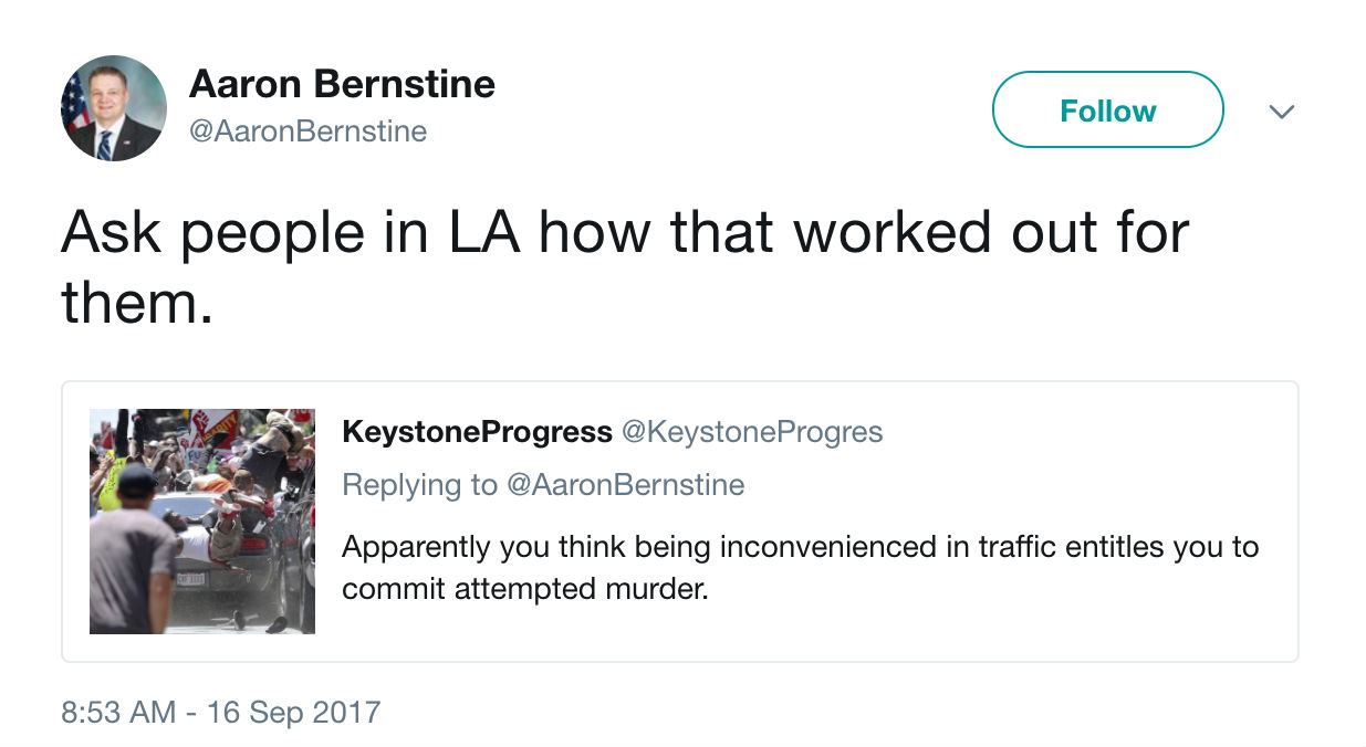Bernstine dismissed replies pointing out that the tactic he is endorsing was recently used by an alleged neo-Nazi to murder a woman during a white supremacist rally in Charlottesville, Virginia, in addition to militant groups like ISIS.