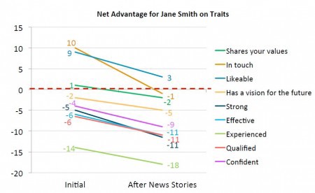But the real point of the survey — and the most salient fact that came from it — is that pushing back on the comodification of a female candidate’s beauty can be just as impactful as the criticism itself. Some respondents heard a defense from Jane Smith, saying, “My appearance is not news and does not deserve to be covered. Rarely do they cover men in this fashion and by doing so they depict women as less serious and having less to offer voters.” Others heard a similar defense from Name It, Change It. In both cases, when they heard that, their votes flipped back. Indeed, Jane Smith gained her first lead of the entire campaign.
