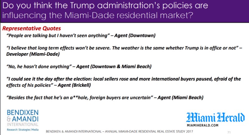 The 2017 Miami-Dade Real Estate Study, conducted by the Miami Herald released with polling firm Bendixen & Amandi International, came out this week. In the past month, they interviewed 100 “of the area’s top brokers, agents and analysts,” while guaranteeing anonymity.