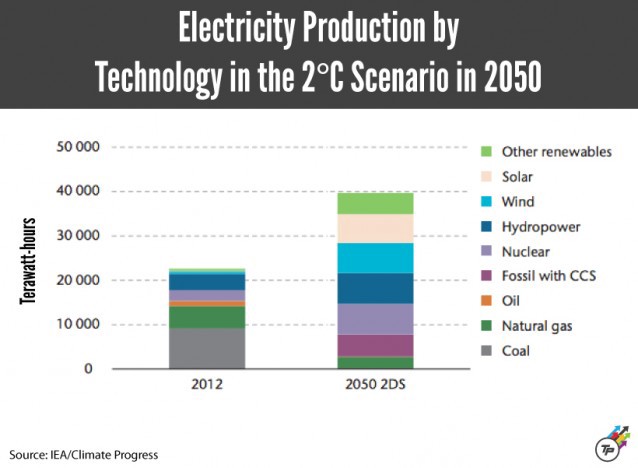 In 2015, the IEA and the Nuclear Energy Agency (NEA) published a technology roadmap for achieving a 2 degrees C scenario (2DS). Here is how it breaks down for 2050 compared to 2012: