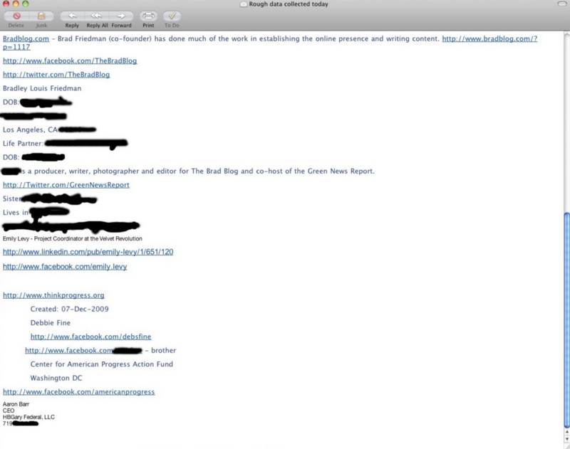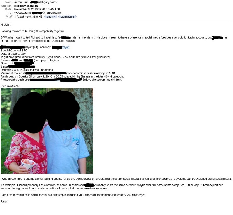 New emails reveal that the private spy company investigated the families and children of the Chamber’s political opponents. The apparent spearhead of this project was Aaron Barr, an executive at HBGary. Barr circulated numerous emails and documents detailing information about political opponents’ children, spouses, and personal lives.