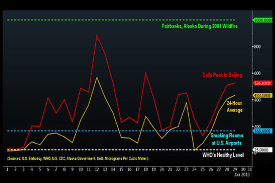 “Beijing’s daily peak and average concentrations of PM2.5, the airborne particulate matter that raises risks for lung and heart diseases, as measured by the U.S. Embassy. The 2013 daily average was 194 micrograms per cubic meter, with an intraday peak of 886 on Jan. 12, the data show. By contrast, PM2.5 levels averaged 166.6 in 16 airport smoking lounges in the U.S.” (Via Bloomberg)