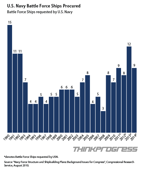The great irony is that the level of nine [ships], which Obama has proposed, is higher than at any time during the [George W.] Bush administration. During the Bush administration, we built less than six ships a year. And so if he’s concerned about the size of the Navy, it’s not Obama he’s blaming because the Navy size is a result of the budget decisions made during the Bush administration.