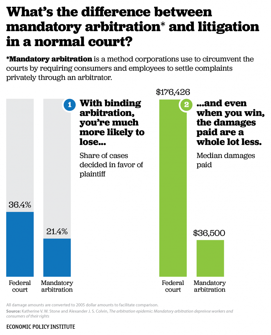 As a paper by the Economic Policy Institute’s Ross Eisenbrey explains, individual workers forced into arbitration are less likely to prevail before an arbitrator than they are before a real judge. And when they do prevail, they typically receive far less money.