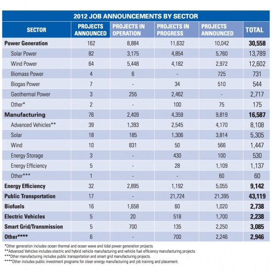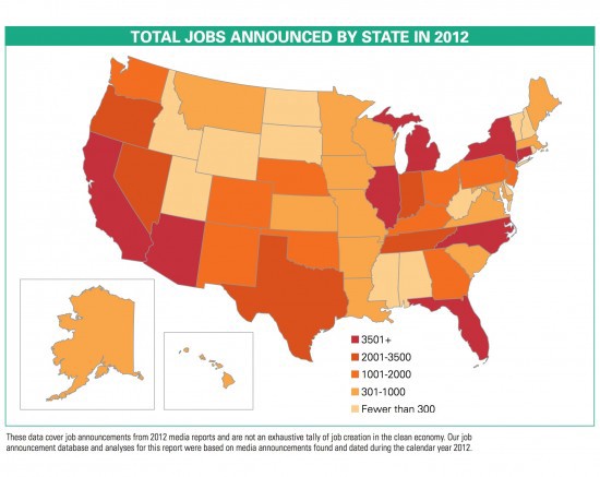 State-wise, California dominated 2012 with 26,354 jobs announced, and North Carolina came in second with 10,867 jobs. The latter state lead the way at years’s end, however, announcing 7,610 of its total jobs in the fourth quarter — over 6,000 more than any other state. Florida, Illinois, Connecticut, Arizona, New York, Michigan, Texas, and Oregon rounded out the rest of the top ten states for clean energy job creation, in that order.