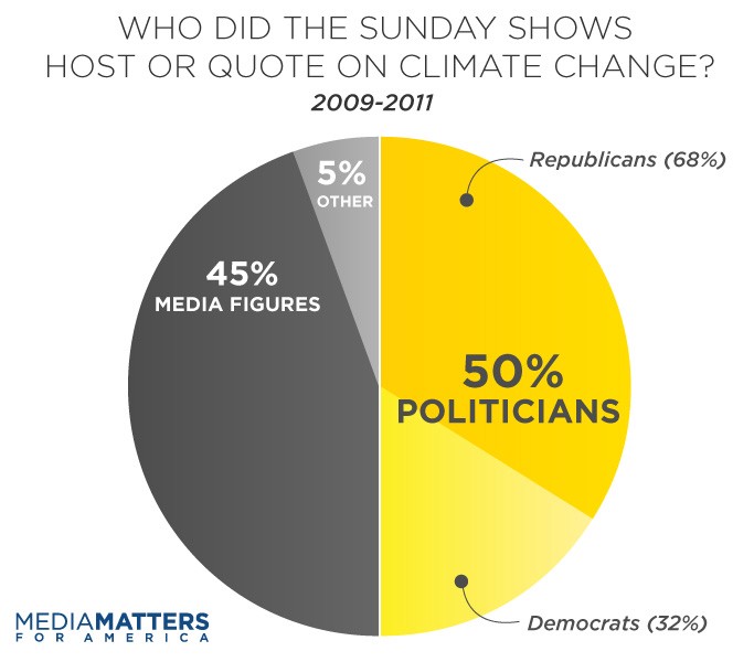 Sunday Shows Featured More Republicans Than Democrats On Climate Change. In total, 68% of the political figures interviewed or quoted by the Sunday shows were Republicans, and 32% were Democrats. In 2011, the only people interviewed or quoted about climate change on the Sunday shows were Republican politicians. Fox News Sunday was the most skewed, featuring eight Republicans and only two Democrats over the three years.