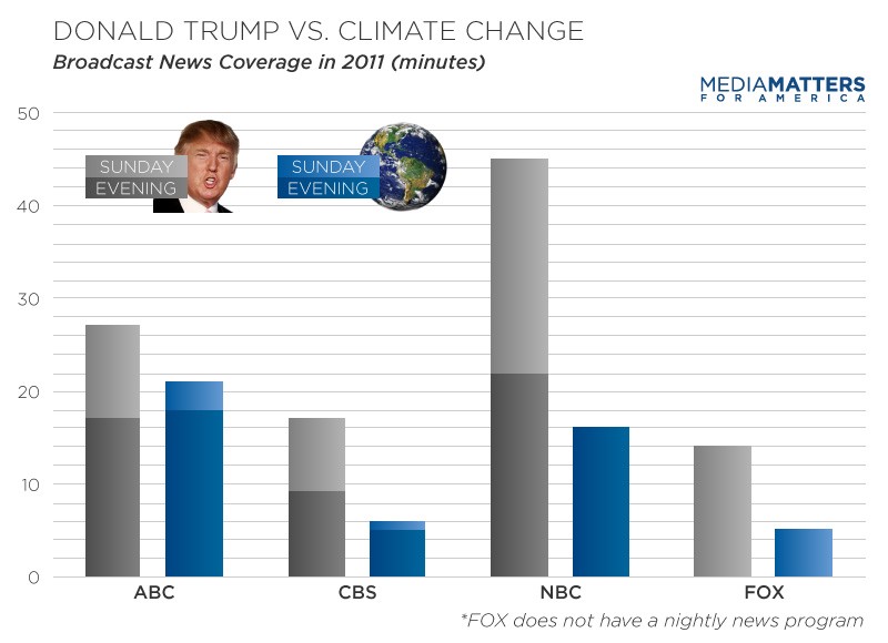 A Media Matters analysis finds that news coverage of climate change on ABC, CBS, NBC and FOX has dropped significantly since 2009. In 2011, these networks spent more than twice as much time discussing Donald Trump as climate change.
