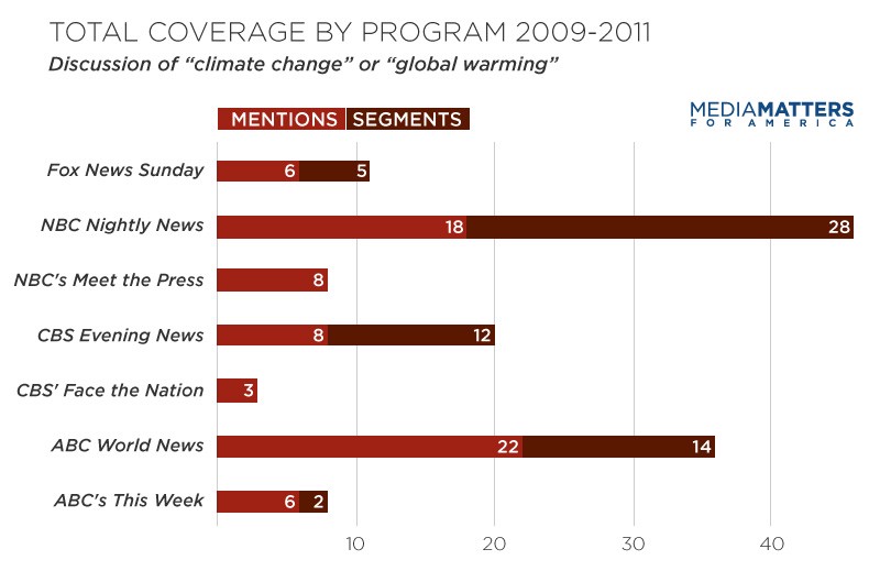 Nightly News Coverage Decreased 72% Between 2009 And 2011. Coverage of climate change on the nightly news programs dropped from over 2 hours in 2009 to just 27 minutes in 2010 and 38 minutes in 2011.