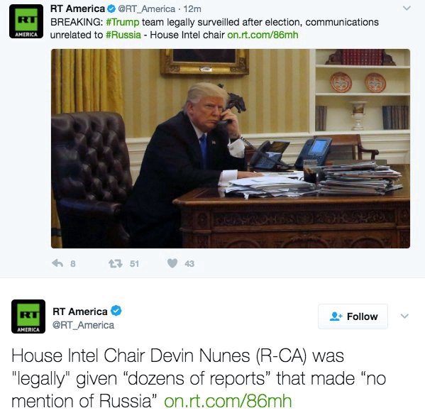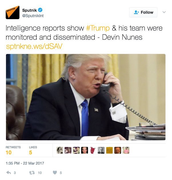 Fake news can be effective. A poll released earlier this week found that 74 percent of Republicans now believe Trump’s evidence-free claim that his Trump Tower office “were wiretapped, or under government surveillance during the 2016 presidential campaign.” When House Intelligence Committee chair and former Trump transition official Rep. Devin Nunes (R-CA) made a clumsy attempt to validate Trump’s claim last week, the story was quickly amplified by Sputnik and RT.
