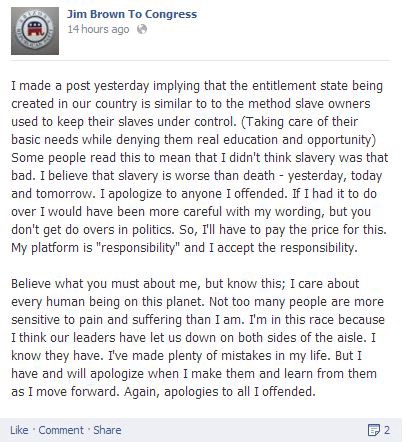 Brown deleted his post and apologized for “implying that the entitlement state being created in our country is similar to to [sic] the method slave owners used to keep their slaves under control.” See the full apology below: