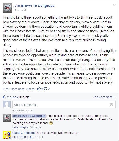 Arizona congressional candidate Jim Brown (R) compared entitlements to slavery in a Facebook post Wednesday, explaining that entitlements give politicians “power over the people allowing them to control us” much like slave owners that “took pretty good care of their slaves and livestock.”