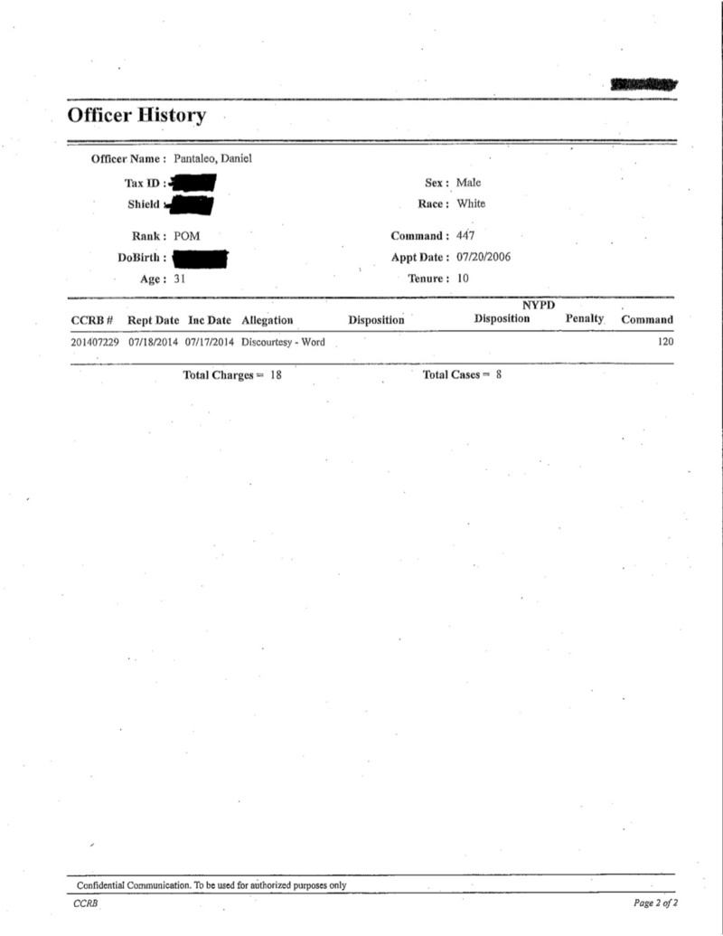 Pantaleo’s CCRB disciplinary record stops in 2014, when he was put on desk duty in response to Garner’s death. The CCRB case number on the document that appears to reference this incident, when entered into the CCRB’s web-based complaint status lookup, indicates an investigation is ongoing.