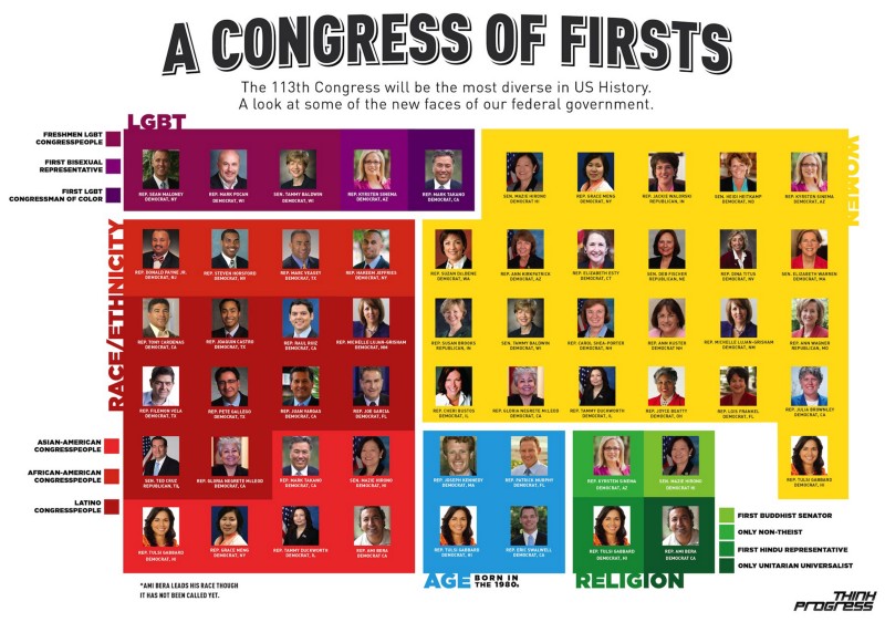 Among other firsts for newly elected Democratic leaders, Rep.-elect Ayanna Pressley will be Massachusetts’ first black congresswoman. Sharice Davids (D-KS) and Deb Haaland (D-NM) were the first Native American women elected to Congress. Rep.-elect (D-NY) Alexandria Ocasio-Cortez is the youngest person to be elected to Congress.