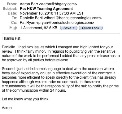 Despite the Chamber’s insistence that they were “not aware” of HBGary’s proposals, a November 16 email between Aaron Barr of HBGary and Berico Technologies indicated that members of Team Themis had been communicating about contracts with Hunton & Williams: