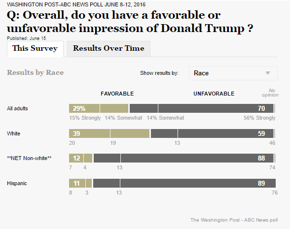 Several new polls released this week bolster his argument, showing Trump’s support among Latino voters sinking to historic lows. A Washington Post-ABC poll found that 89 percent of Latinos have a unfavorable view of Trump, with two-thirds reporting a “strongly unfavorable” impression. Another poll by Fox News Latino found Trump trailing Hillary Clinton by nearly forty points with Latino voters.
