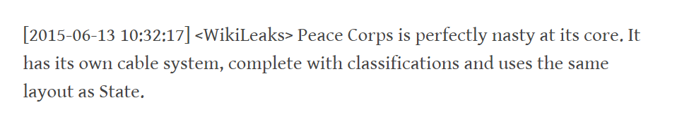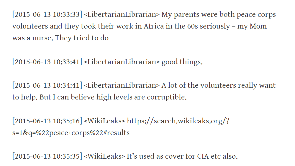 The Twitter messages detail new conspiracy theories that Assange has peddled, as well. For instance, in a series of messages from June 2015, Assange informs the rest of the group the Peace Corps is, in reality, a group that is “used as cover for [the] CIA”. (Full disclosure: This reporter is a Returned Peace Corps Volunteer who served in Kazakhstan.)