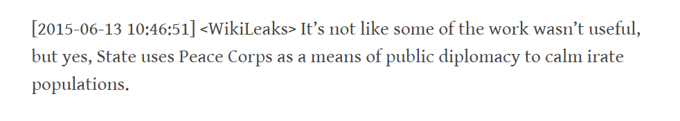 Peace Corps volunteers, of course, aren’t actually used by the State Department to “calm irate populations.” Nor, as Assange appears unaware, is the Peace Corps a “cover” for agencies like the CIA.