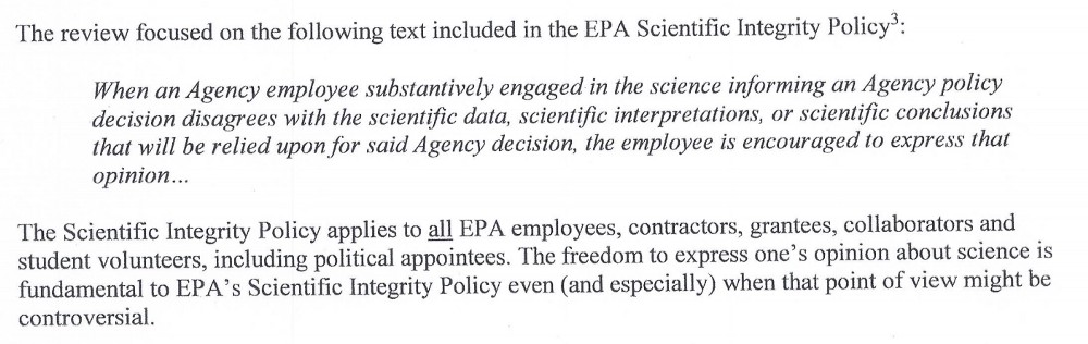 But reaching exoneration required the panel to cherry-pick an irrelevant part of the agency’s Scientific Integrity Policy, while ignoring the injunction to managers to accurately represent EPA findings to the public.