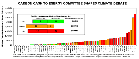 Carbon-sector contributions to members of the House Committee on Energy & Commerce. Click to enlarge.The obstructionist politicians working to weaken the ACES Act are ironically threatening the future of the industries who fill their campaign coffers. The nation needs to set strong standards for energy efficiency, renewable energy, and global warming pollution in order to compete in the 21st century economy. “Limiting greenhouse gas emissions will enhance U.S. competitiveness,” Center for American Progress senior fellow Jake Caldwell writes. “A carbon cap-and-trade program will reduce emissions and send a predictable price signal on carbon, which in turn will spur major investment in energy efficient and low-carbon technologies, foster innovation and upgrades, and create jobs and export led growth in clean energy technology.”