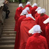 Inspired by the protest in Texas, Missouri activists did the same: Six weeks later, eleven women dressed in Handmaid-chic and carrying signs that read “Don’t let Missouri become Gilead” marched silently into their state capitol. (Gilead is what America becomes in Atwood’s fiction, an authoritarian patriarchal regime where women have no rights and, honestly, the men don’t wind up too happy either.) At stake was a budget amendment which would bar the Missouri Women’s State Funded Health Services Program from covering care at any clinic that provides abortion services.
