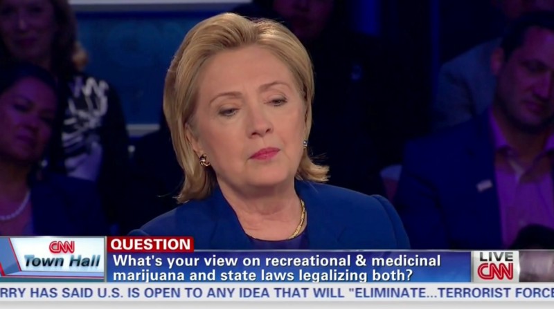“I don’t think we’ve done enough research yet although I think for people who are in extreme medical conditions and have anecdotal evidence that it works, there should be availability under appropriate circumstances,” she continued. She made reference to the two states that have passed recreational marijuana, but not the more than 20 that already have medical marijuana laws. Nor was she asked about federal suppression of marijuana research.