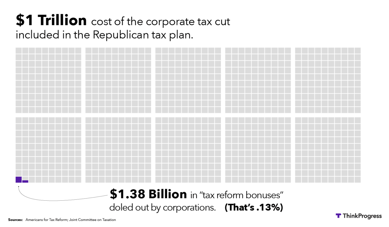 A number of companies, including Wells Fargo, Boeing, AT&T, and Comcast, have all announced similar bonuses for their employees in recent days, with most handing out lump sums of around $1,000 per person. While the numbers may appear promising, corporations are actually spending less than one percent of their tax windfall on bonuses for employees.