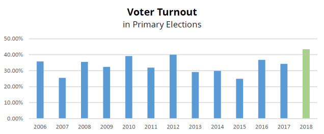 This was the first year that voters in King County, the state’s largest county that includes the city of Seattle, did not need to buy a stamp in order to vote — King County voters receive prepaid postage. The result, according to the King County Elections Department, was a higher rate of voter turnout in 2018’s primary elections than in any previous primary since 2004.