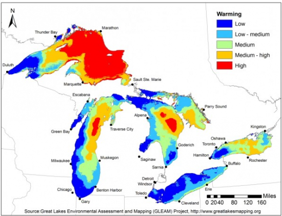 The two maps below developed by the Great Lakes Environmental Assessment and Mapping project (GLEAM) illustrate the severity of the environmental impacts on the lakes, as well as the warming temperature of the lakes.
