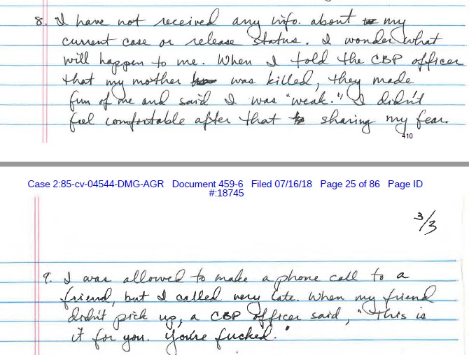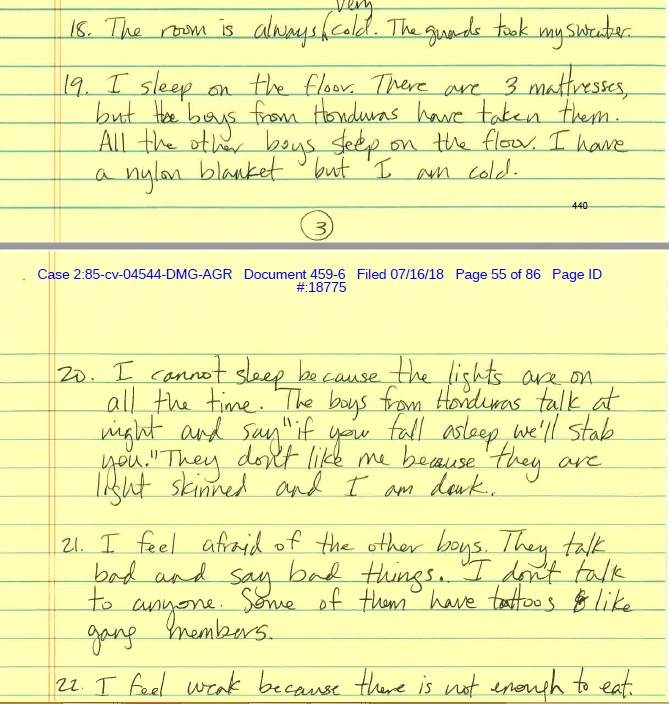 “There is no privacy. It is dirty and they don’t clean it,” a Guatemalan boy named Erick said, describing his first three days in Border Patrol custody. “The room is always cold. The guards took my sweater. I sleep on the floor. There are 3 mattresses, but the boys from Honduras have taken them.”