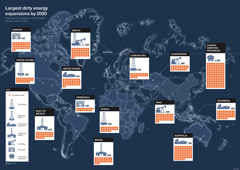 - A plan to export new coal from the Pacific Northwest. This would add 420 million tons of carbon a year by 2020. Activists and even some American politicians have already been battling the project for some time.