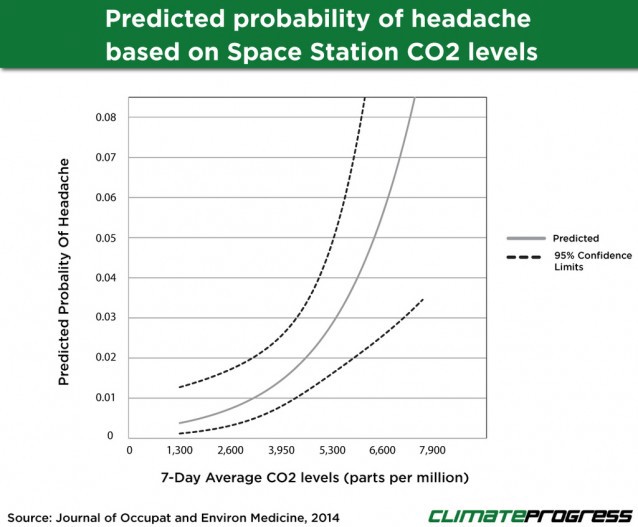 Significantly, these impacts on astronauts on the ISS do not directly translate to impacts on a typical person on Earth. On the one hand, “microgravity increases sensitivity to CO2,” as Dr. Alexander explained to Climate Progress. On the other hand, astronauts are healthier and more fit than the general population, and, as the 2014 JOEM article put it, “Notably, astronauts are screened during selection for underlying cardiovascular and neurovascular conditions that may predispose to headaches.”