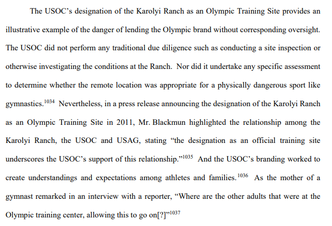 After detailing all of the lies that Blackmun told investigators, Ropes & Gray lay down the gauntlet, letting it be known that in the course of their investigation — which included more than 100 interviews, including more than 60 current and former employees of USOC and USAG, and a review of well over 1.3 million documents — they found no evidence that Blackmun ever convened an internal meeting about Nassar. Similarly, they found no evidence to lend credence to the notion that he or Ashley ever told any other individual at USOC that Nassar was under investigation by the FBI for sexual misconduct stemming from allegations that he had sexually abused minor Olympic athletes at a USOC training center.