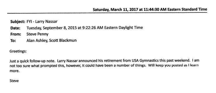 The next time Penny contacted the USOC about this, it was on September 8, 2015, when Penny sent an e-mail to Blackmun and Ashley notifying them of Nassar’s retirement. (Penny lies in this missive, claiming to be “not too sure what prompted this,” even though Penny and USAG had already told Nassar he was under investigation for sexual abuse. Nassar publicly portrayed his departure from USAG as a retirement by choice, and everyone — USAG, USOC, and the FBI — allowed that lie to stand.)