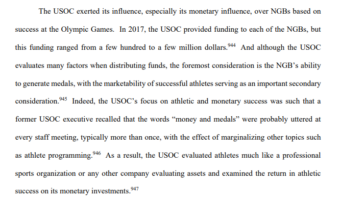 The report’s conclusion makes no mistake about the arrangement: “The foremost consideration is the NGB’s ability to generate medals, with the marketability of successful athletes serving as an important secondary consideration.”