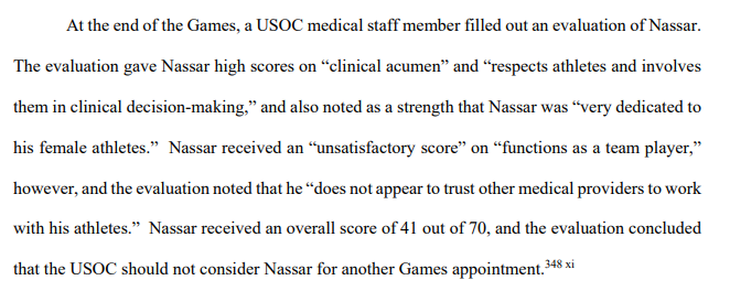 Then, at the end of the 2012 Games, a USOC medical staff member filled out an evaluation of Nassar, which concluded that the USOC should not consider Nassar as a doctor for future Olympics.