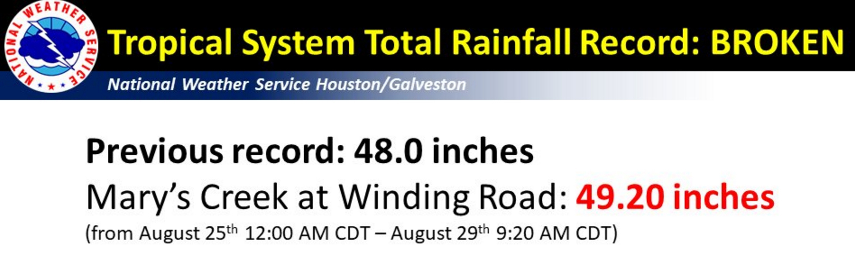“The record for total rainfall from a tropical system has been BROKEN!” the National Weather Service tweeted Tuesday morning. The previous record for wettest tropical system in the continental United States was 48 inches. Harvey had already hit 49.20, and the rain was still coming.