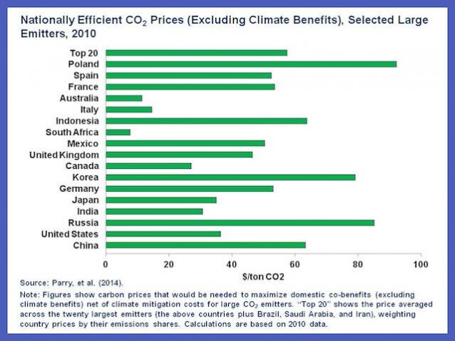 The IMF notes that because the co-benefits vary by country — “they are relatively high in China and Poland — where most of the CO2 reduction would come from less reliance on coal and there is high population” — different countries have different optimal CO2 prices: