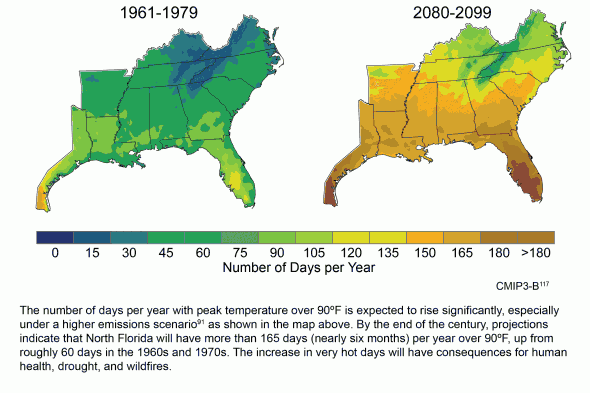 It truly will be an endless summer over much of the South (see also NASA’s Hansen: “If We Stay on With Business as Usual, the Southern U.S. Will Become Almost Uninhabitable”).