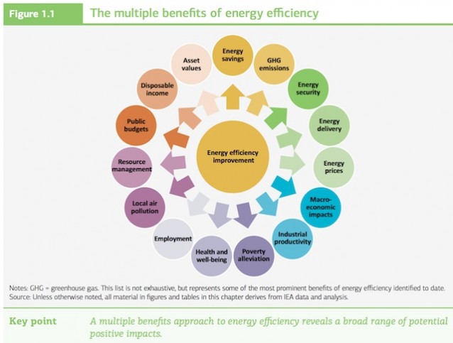 What makes inaction doubly tragic is that a rapid transition to a clean energy economy would be a tremendous boost to worker productivity. A 232-page International Energy Agency report from 2014, “Capturing the Multiple Benefits of Energy Efficiency” found that “the uptake of economically viable energy efficiency investments has the potential to boost cumulative economic output through 2035 by USD 18 trillion,” which is larger than the current size of the U.S. economy!