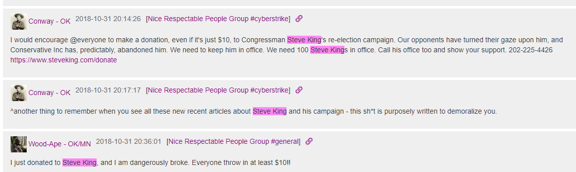 The leaked chat logs show Identity Evropa members were full of praise for the more hard line elements of the Republican Party, chiefly Rep. Steve King (R-IA). King has a long and storied history of re-tweeting far-right personalities and espousing white nationalist views; most recently, King drew widespread criticism for asking when the term “white nationalist” became offensive during an interview with the New York Times in January.