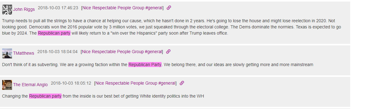 Now, however, newly leaked chat logs obtained by Unicorn Riot reveal that Casey doesn’t just want to present a clean-cut version of Identity Evropa to the world; he actively wants its members to get involved with the Republican Party.