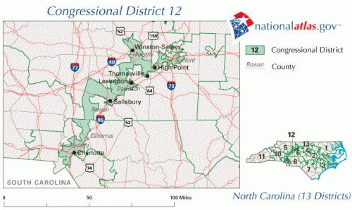 Thanks to some spectacular gerrymandering (see below) just two of North Carolina’s 13 U.S. House districts have a majority of voters that are not white, including the one represented now by Rep. Adams. The district, which snakes across six different counties to include the urban centers of Charlotte and Greensboro is an example of what she has called the “stacking and packing African Americans,” a practice that has made all the surrounding districts safer for Republicans.