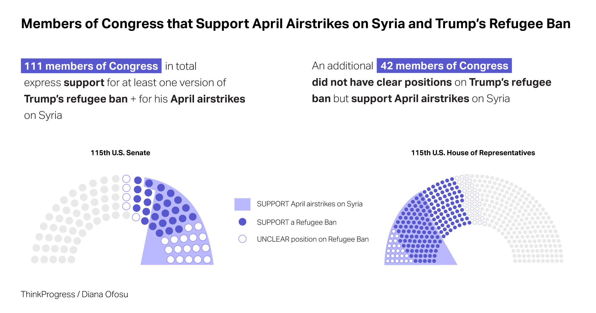 Like Trump, nearly all the members of Congress who said they support the airstrikes also expressed humanitarian concerns for the plight of the Syrian people. But 152 lawmakers tallied by Think Progress either expressed support for, or failed to condemn last year’s Muslim ban, which halted refugee resettlement for 120 days and suspended all Syrian immigrant and non-immigrant visas for 90 days.